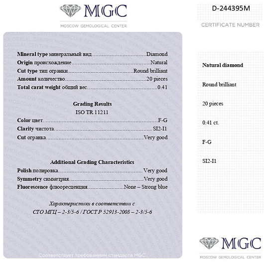 Природные бриллианты 0.41 Ct, F-G/SI2-I1 "Круг" MGC 20 шт.