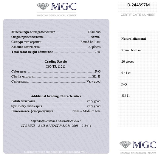 Природные бриллианты 0.41 Ct, F-G/SI2-I1 "Круг" MGC