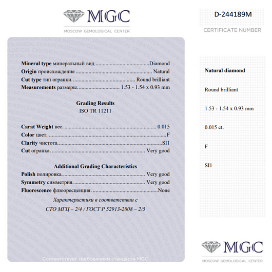 Природный бриллиант 0.015 Ct, F/SI1 "Круг" MGC