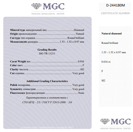 Природный бриллиант 0.016 Ct, F/SI2 "Круг" MGC