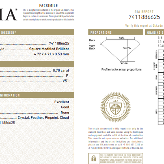 Природный бриллиант 0.70 Ct, F/VS1 огранка "Принцесса" GIA