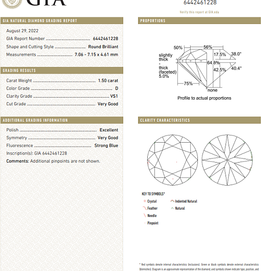 Природный бриллиант 1.50 Ct, D/VS1 "Круг" GIA