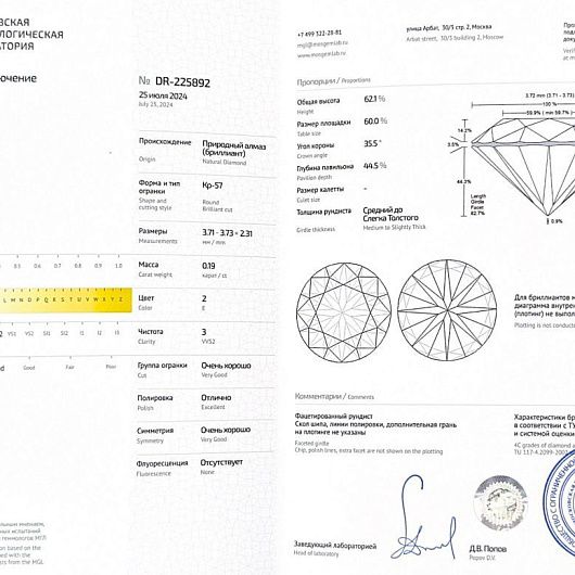 Природный бриллиант 0.19 Ct, E/VVS2, "Круг" MGL
