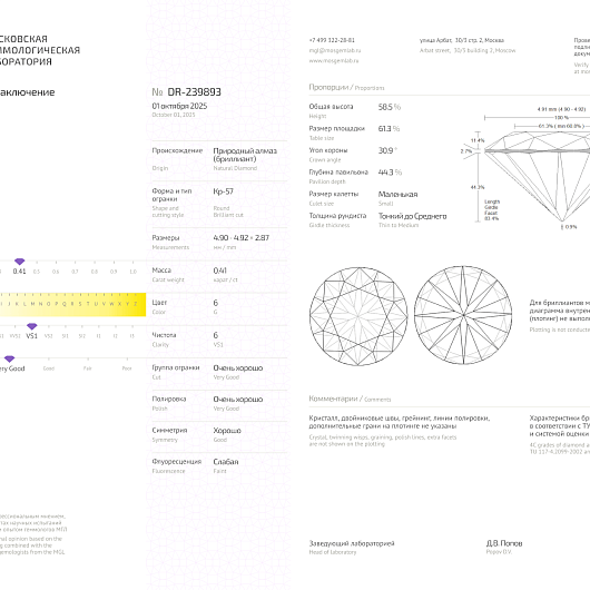 Природный бриллиант 0.41 Ct, G/VS1, "Круг" MGL