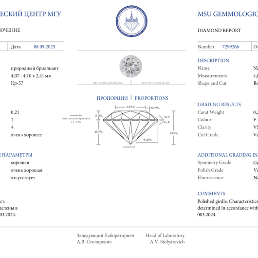 Природный бриллиант 0.21 Ct, F/VS1, "Круг" МГУ