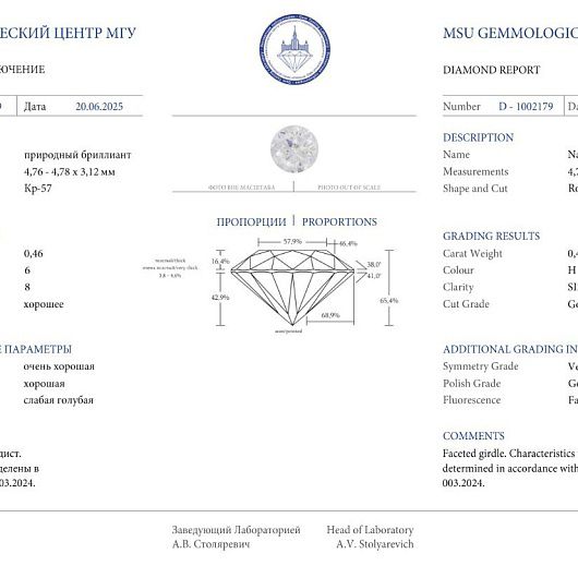 Природный бриллиант 0.46 Ct, H/SI2, "Круг" МГУ