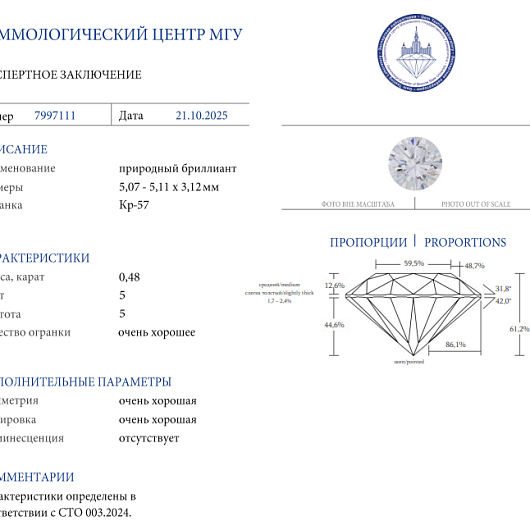 Природный бриллиант 0.48 Ct G/VS1 "Круг"