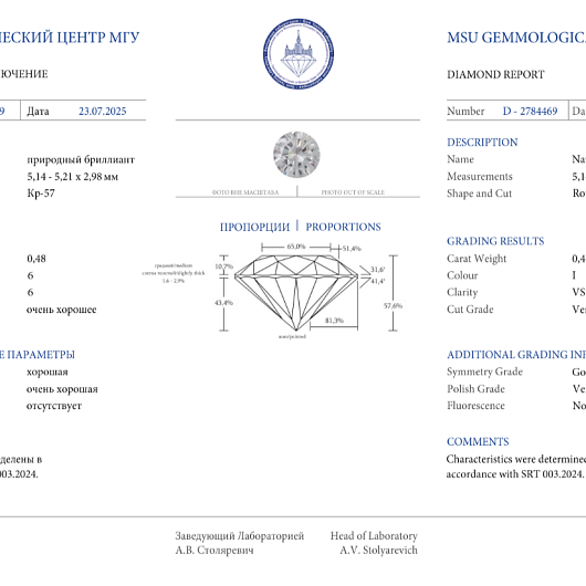 Природный бриллиант 0.48 Ct, I/VS2, "Круг" МГУ