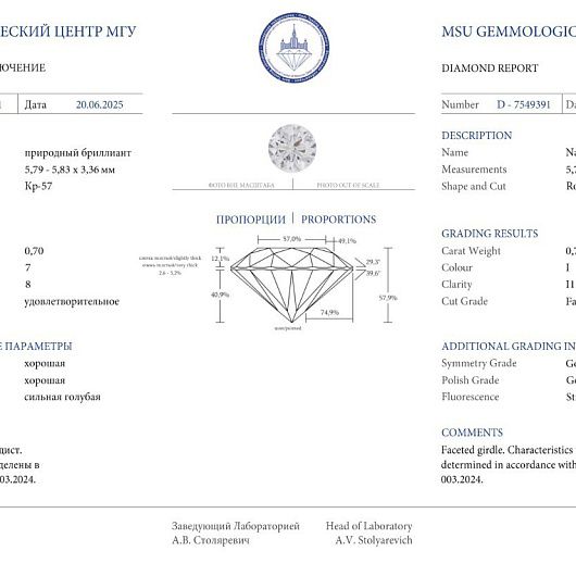 Природный бриллиант 0.70 Ct, I/I1, "Круг" МГУ