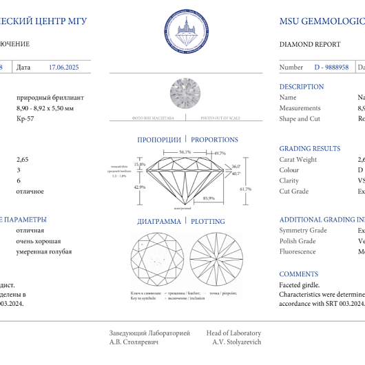 Природный бриллиант 2.65 Ct, D/VS2, "Круг" МГУ